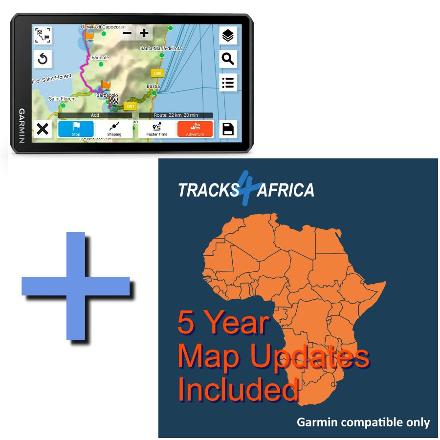 Stay up to date with built-in Wi-Fi for wireless map and software updates. Access extensive preloaded topographic and street maps for Europe and the Middle East. Additional regional maps, including Tracks4Africa, are available via Garmin Express.