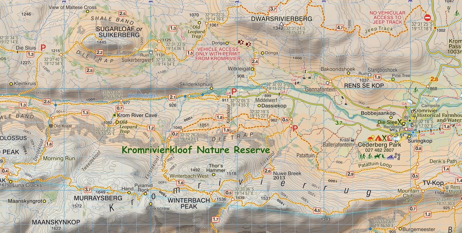 - The Cederberg Hiking Map documents every public footpath, including distances, GPS coordinates, altitudes, and junction details.